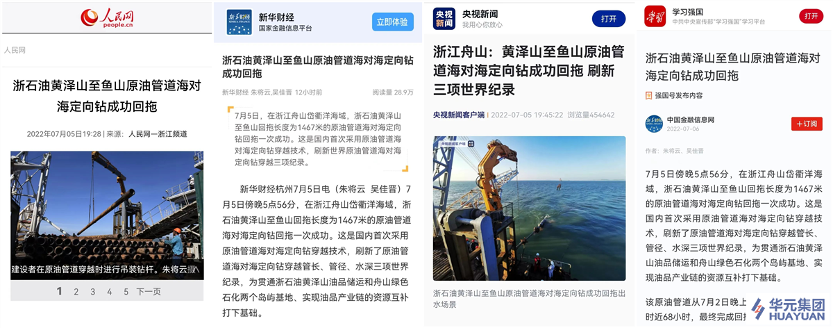 7月5日傍晚5點56分,在浙江舟山岱衢洋海域,浙石油黃澤山至魚山回拖長度為1467米的原油管道海對海定向鉆回拖實現(xiàn)一次成功。這是國內(nèi)首次采用原油管道海對海定向鉆穿越技術,刷新了原油管道海對海定向鉆穿越領域管線長度、管徑寬度、水位深度等三項世界紀錄。